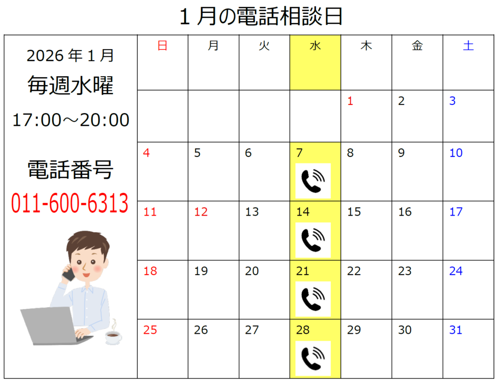 電話相談 2022.09.192026.01.06 毎週水曜日:午後5時から午後8時 ✆ 011-600-6313 どさんこコロでは、精神科病院に入院中の方々や、そのご家族、関係者からの電話相談を受けます。面会のご希望があれば、病院をお訪ねします。当面は札幌圏限定になります。相談料は無料です。電話の通話料はご負担ください。留守電のメッセージに折り返しをいたしませんが、どうぞご了承ください。また、お手紙でのご相談はご遠慮いただいております。ご了解いただけましたらありがたく存じます。